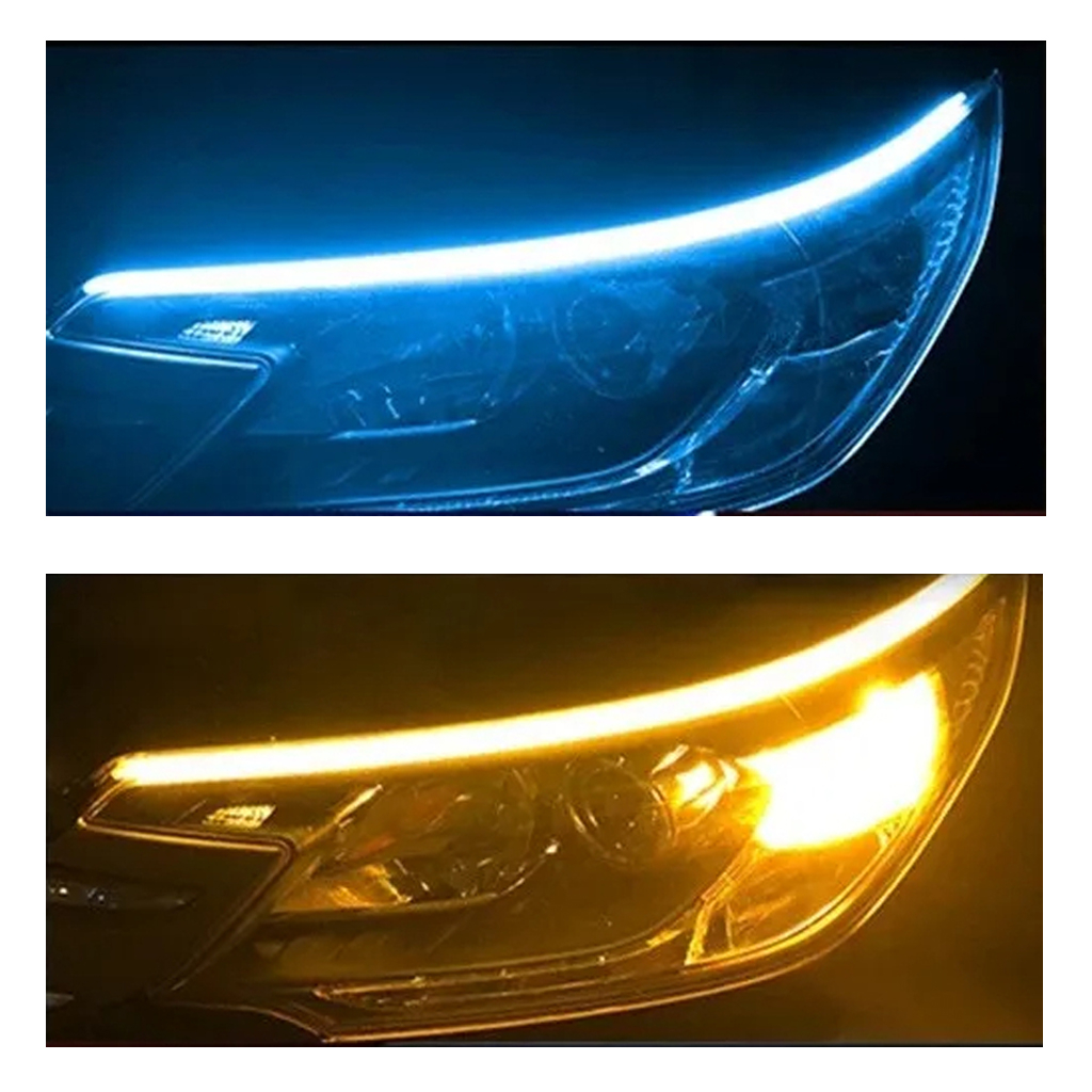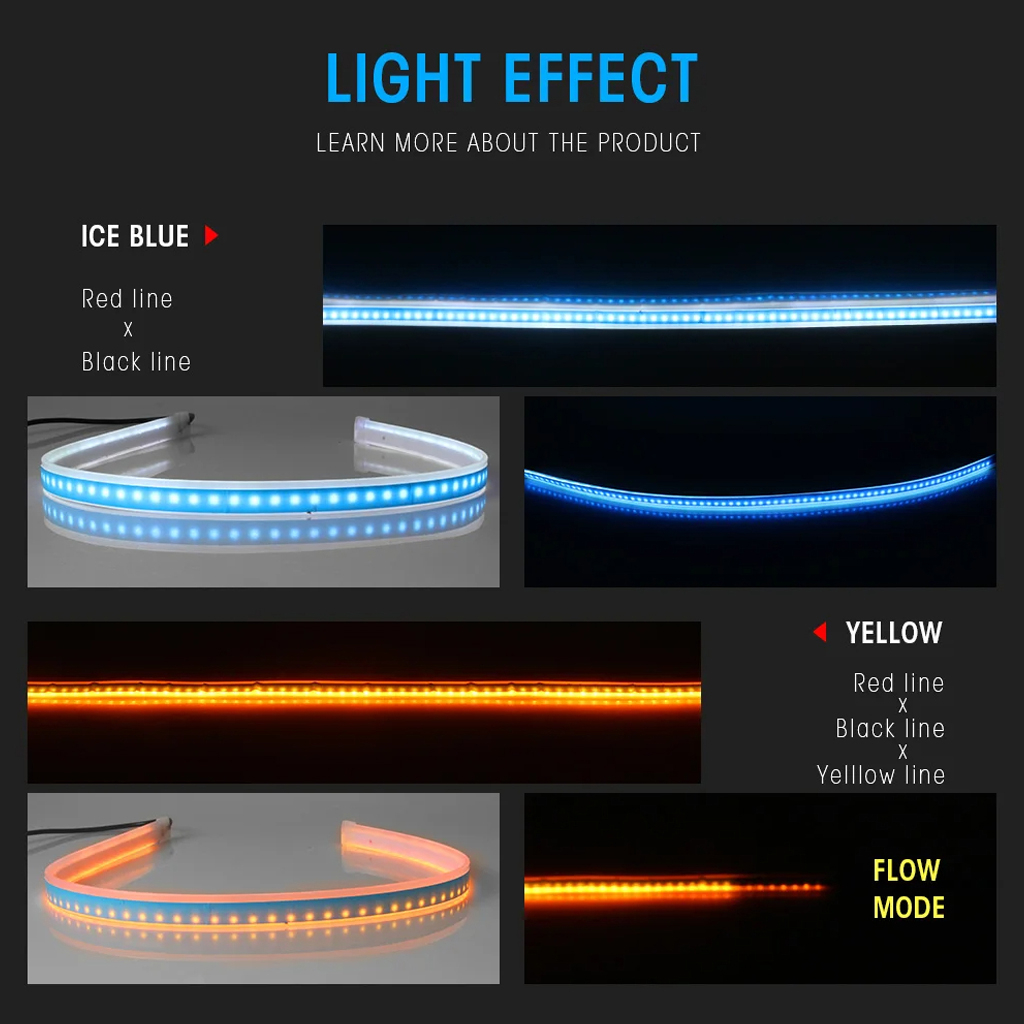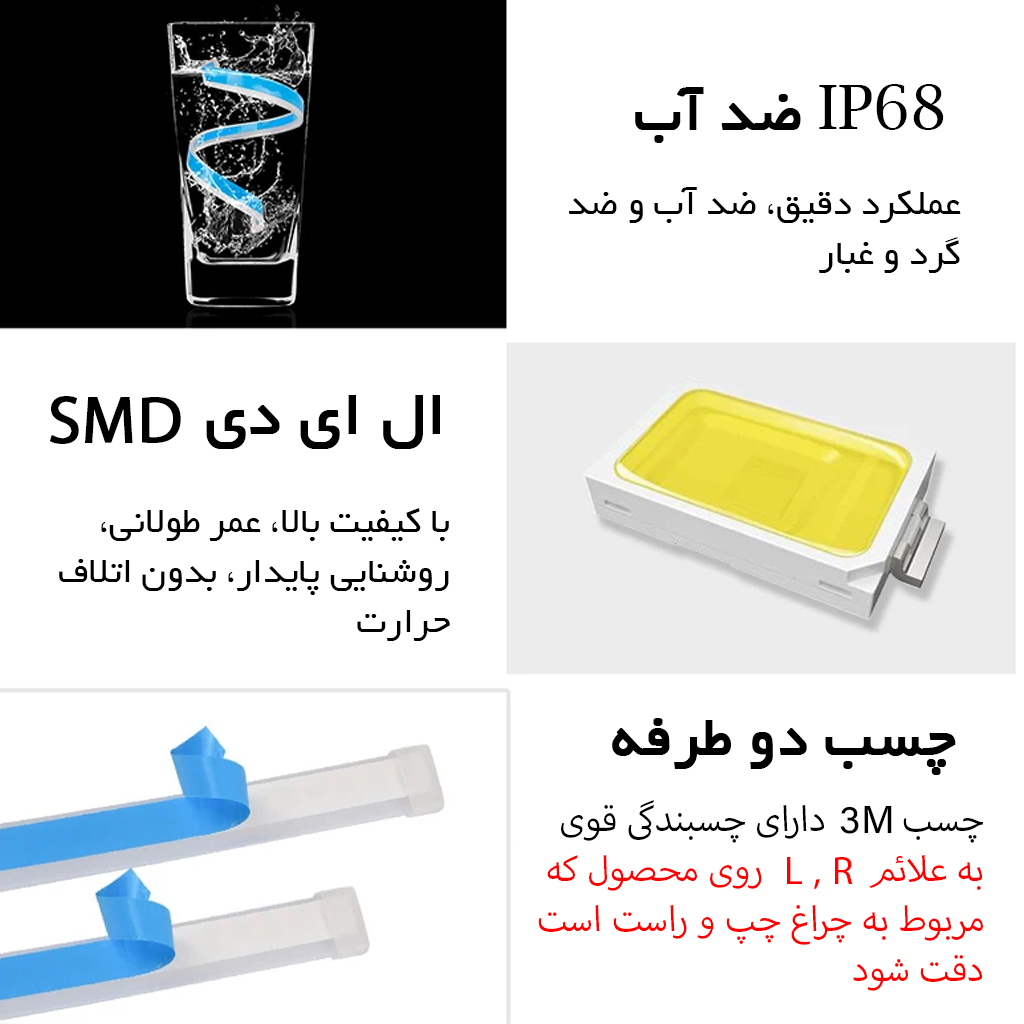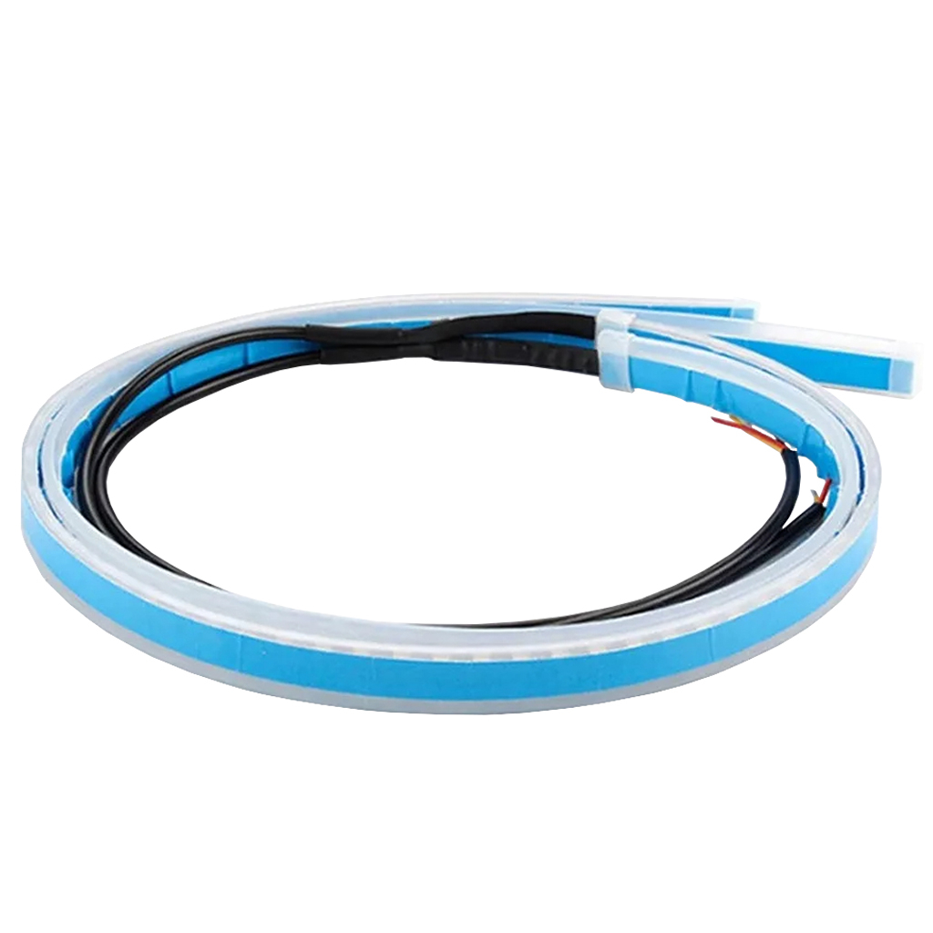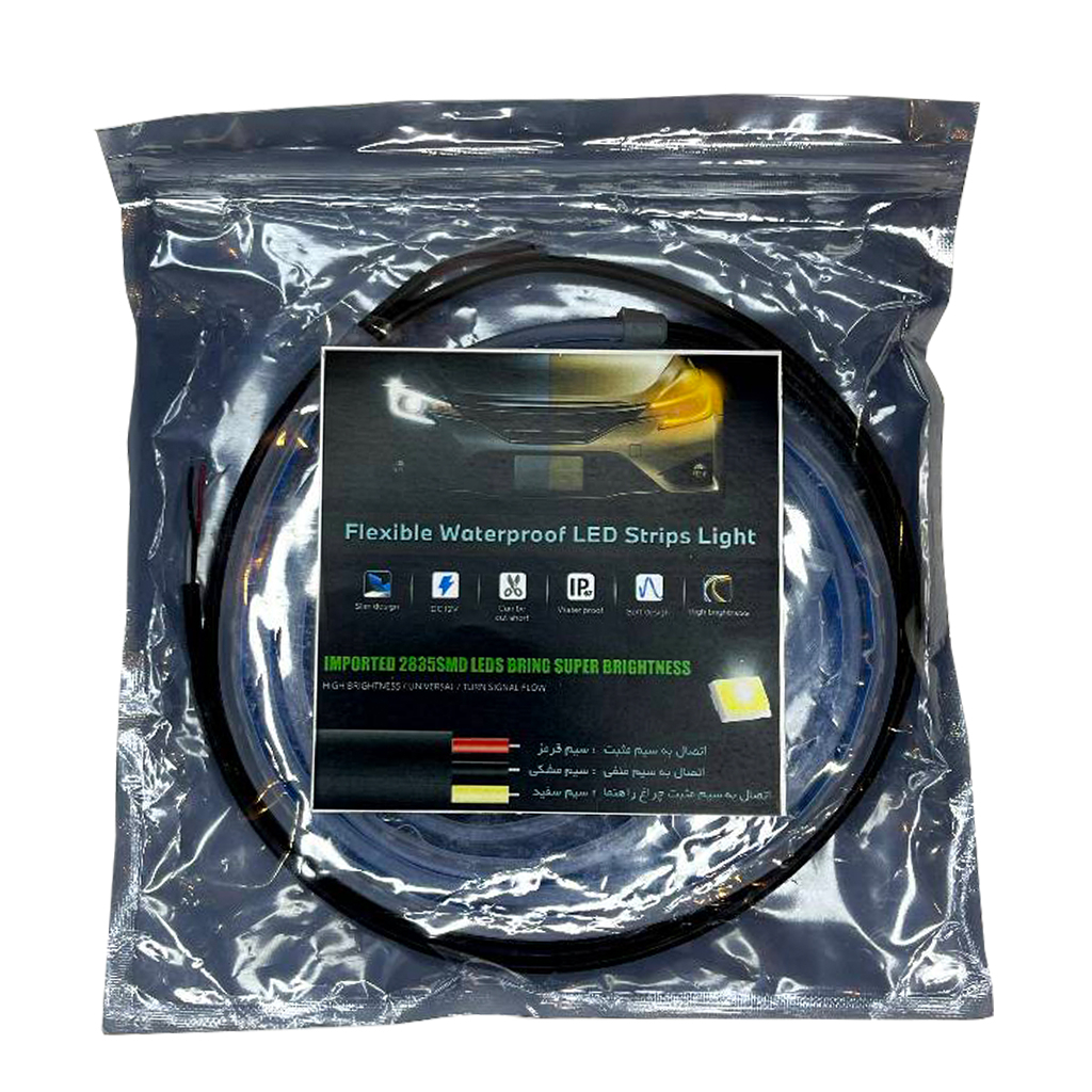 دیلایت خودرو مدل Flexible Waterproof LED Strips Light به منظور نصب بیرون کاسه چراغ و داخل آن به طول 60 سانتی متر طراحی و ساخته شده است. نور این چراغ دارای دو رنگ آبی یخی برای حالت دی لایت و نارنجی برای حالت راهنما می باشد و دارای دمو WELCOME جهت روشن شدن دی لایت و حالت دموی آبشاری جهت روشن شدن راهنماست. روشنایی این محصول با استفاده از لامپ های اس ام دی باکیفیت و طول عمر بالا تامین می شود و بدنه آن از جنس سیلیکونی انعطاف پذیر و ضد آب است که برای تغییر شکل در اشکال مختلف می تواند مورد استفاده قرار بگیرد. برای نصب دیلایت سه سیم متصل به آن موجود است، سیم قرمز جهت اتصال به سیم مثبت، سیم مشکی جهت اتصال به سیم منفی (یا اتصال به بدنه) و سیم سفید جهت اتصال به سیم مثبت چراغ راهنما می باشد. به منظور نصب یک لایه چسب روی یک طرف آن وجود دارد. هنگام نصب دیلایت خودرو سطح مورد نظر اعم از روی چراغ (در قسمت درز مابین کاپوت و چراغ های جلو) و داخل کاسه چراغ را از گرد و خاک تمیز نموده و رویه چسب را جدا کرده و در محل مورد نظر نصب نمایید. برای ایجاد جلوه بهتر و حرفه ای تر، هنگام نصب به راستا و امتداد خطوط دیلایت و چراغ دقت نمایید.